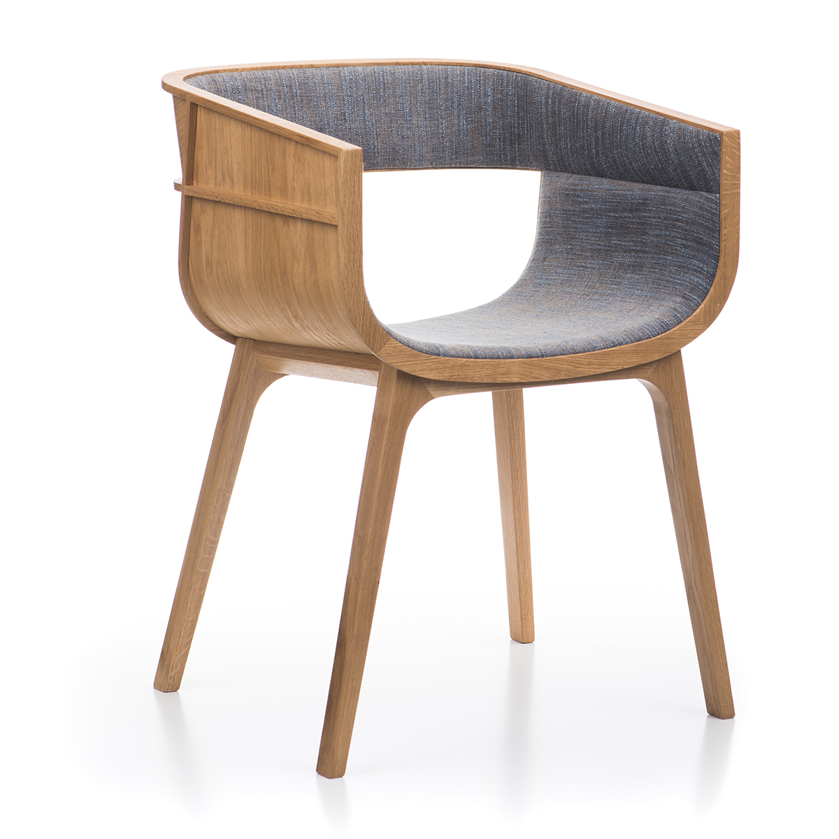 The armchair structure is made of oak mass construction. The backrest is made of veneer sheets decorated with oak veneer. Upholstery and wood color at customer's request.