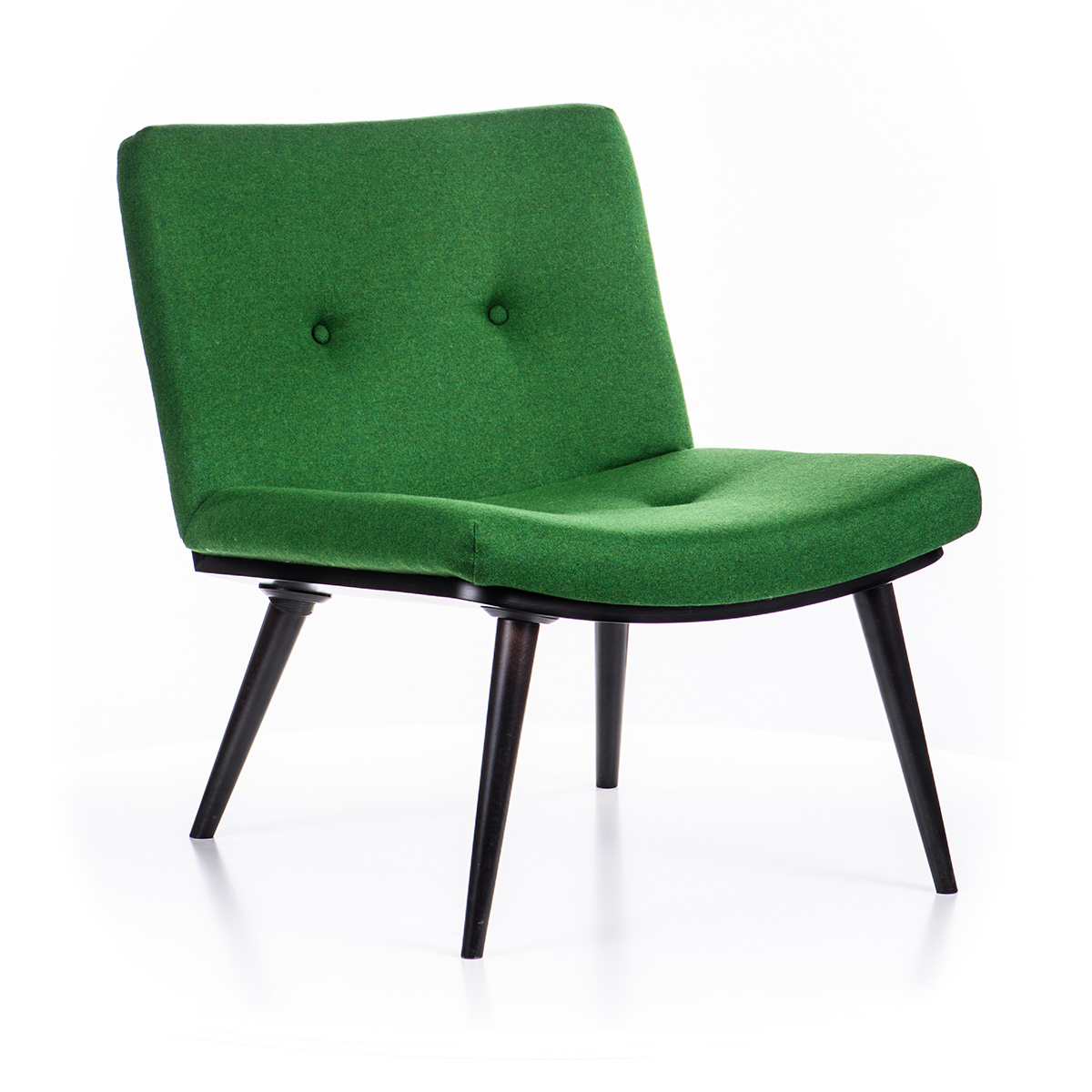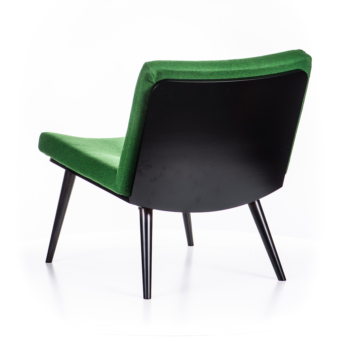 The armchair structure is made of oak mass construction. The backrest is made of upholstered veneer sheeting. Upholstery and wood color at customer's request.